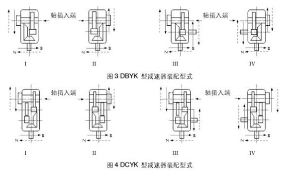 按輸出軸可分I、Ⅱ、Ⅲ、Ⅳ四種裝配型式。I||型為不帶逆止器型,Ⅲ、Ⅳ型為可裝制動f逆止】器型。結構簡圖見圖1、圖2、圖3、圖4。