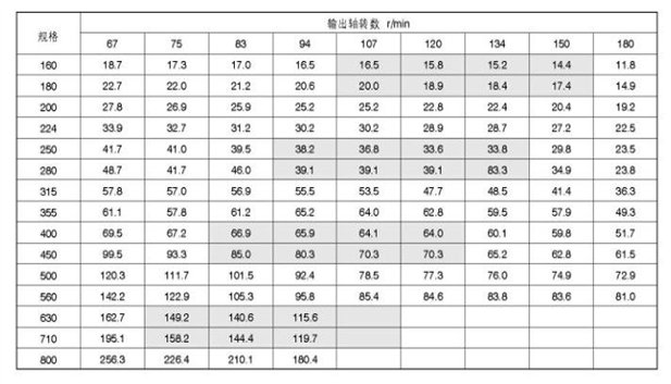 450,500,560,630,710,800mm:每種規(guī)格均有11種傳動比(16,18,20,22.4,25,28,315,35.5,40,45),兩種旋向,四種裝配型式,分別組成660種減速器。